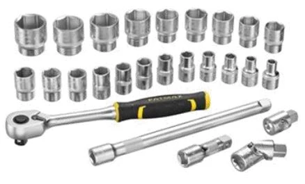 - 12x douilles 1/2″ (6 côtés) : 8- 9- 10- 11- 12- 13- 14- 15- 16- 17- 18- 19- 20- 21- 22- 23- 24- 27- 30- 32- 34 mm