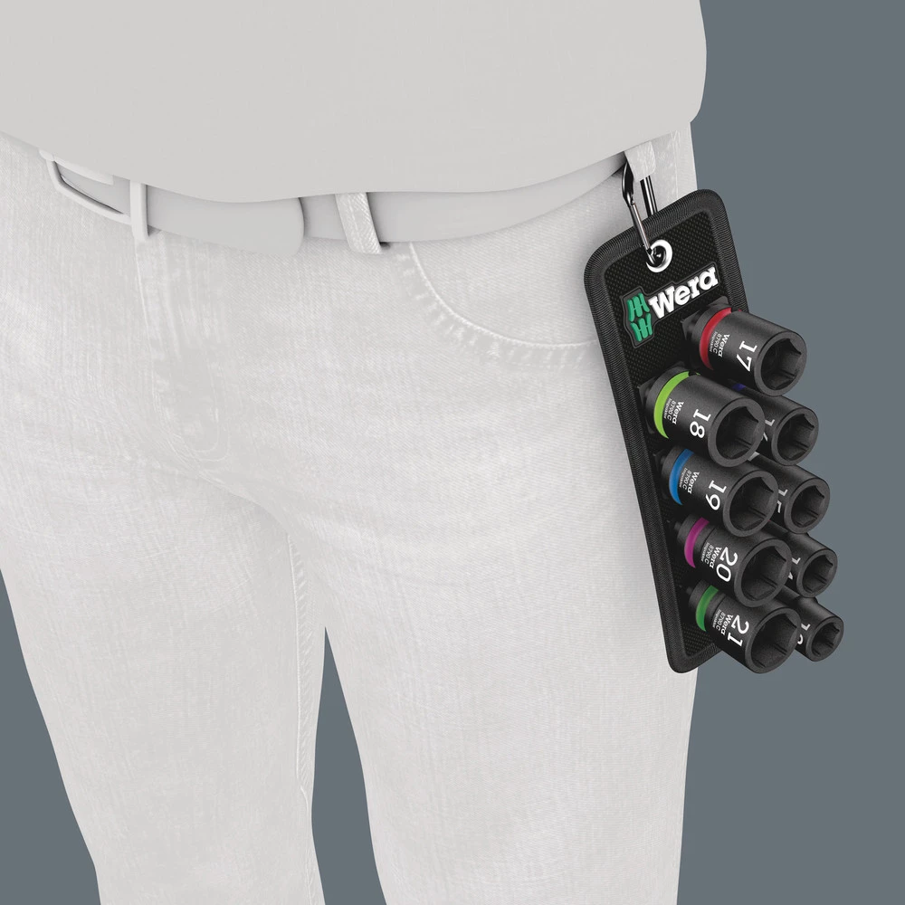 - Ceinture en tissu robuste au design caractéristique de Wera avec 9 prises Impaktor, toutes extrêmement compactes.